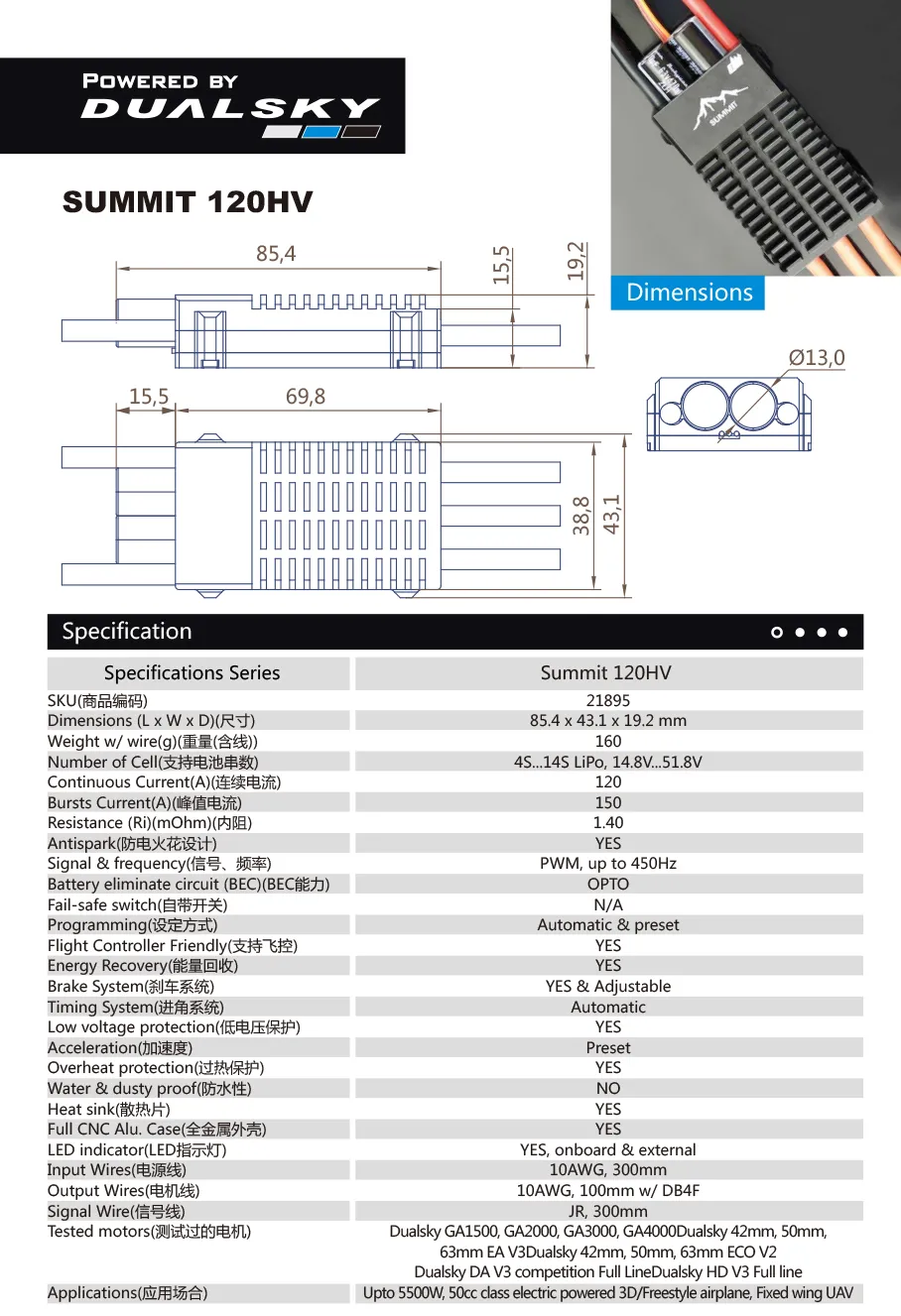 Here, we have Dualsky Summit 120HV 120 amps 14S Lipo Brushless Speed Controller with 32-bit ARM